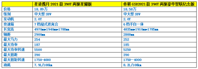 为了对星途揽月有更直观的认识,对消费者的购车计划提供借鉴,我们在星途揽月2021款390T两驱星耀版,和价位接近、同为七座SUV的传祺GS82021款390T两驱豪华智联纪念版两款车之间(以下简称星途揽月和传祺GS8),做一个对比,看看究竟哪款车更值得购买。