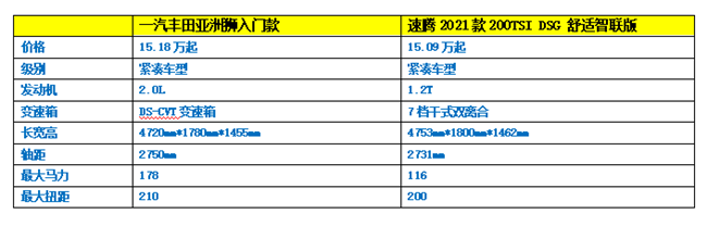 出于同类项式的处女座较真,我们选择了两款价位接近的车型进行对比,毕竟价格一直是中低端汽车市场最敏感的参照素:预售价15.18万起的亚洲狮入门款,和厂家指导价15.09万元起的速腾2021款200TSI DSG舒适智联版(以下简称亚洲狮和速腾)。